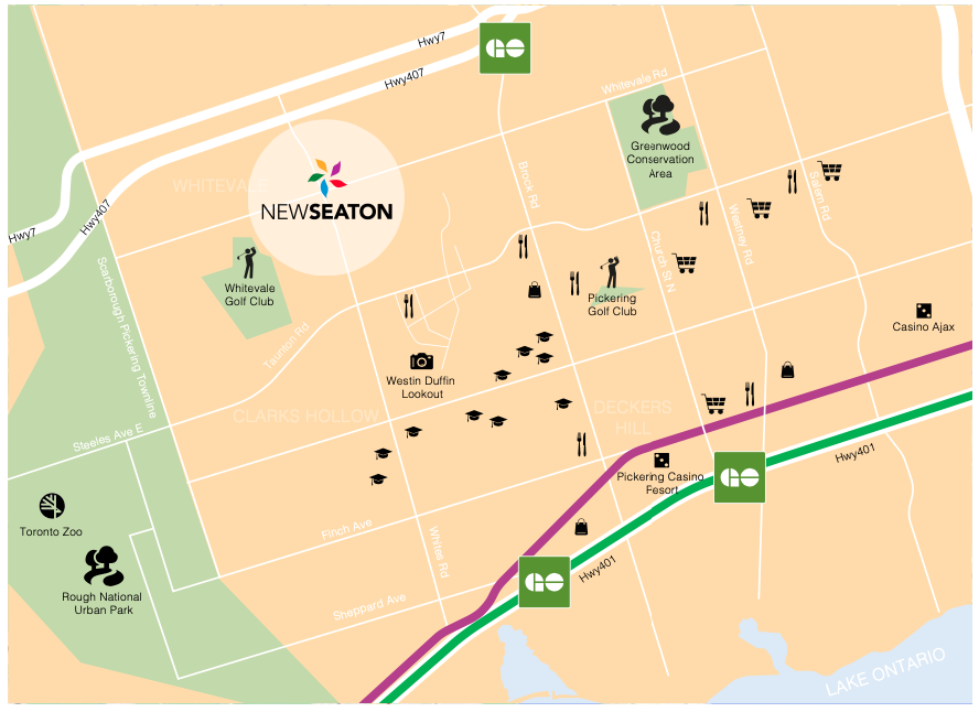 New Seaton is strategically located in North Pickering, offering a perfect blend of urban convenience and suburban tranquility. With quick access to major highways such as Highway 407 (4 minutes away), Highway 401 (7 minutes away), and Highway 412, commuting to Toronto and surrounding areas is seamless. The development is also just 10 minutes from Pickering GO Station, making public transportation an easy option for residents. Additionally, the area is rich in recreational spaces, including Rouge National Urban Park, Petticoat Creek Conservation Area, and the Pickering Millennium Waterfront Trail, providing residents with ample outdoor activities and scenic landscapes.